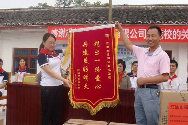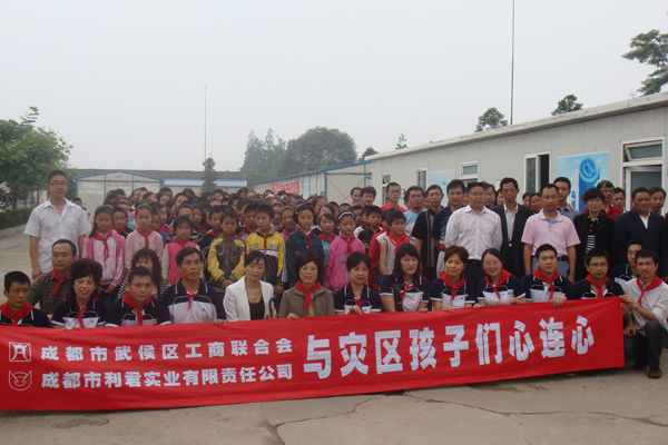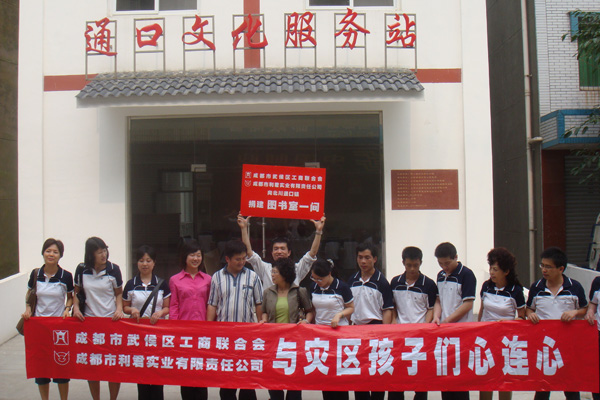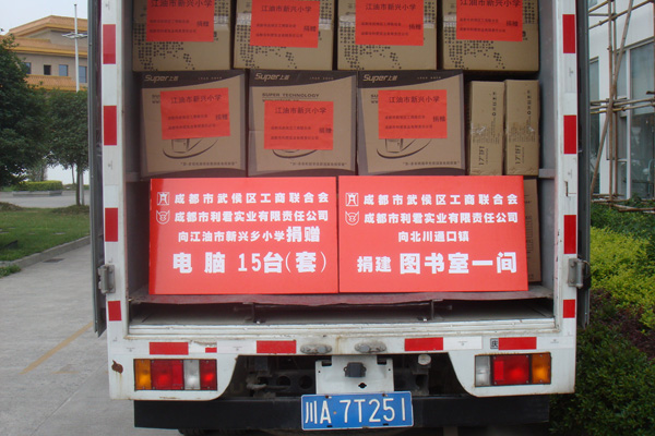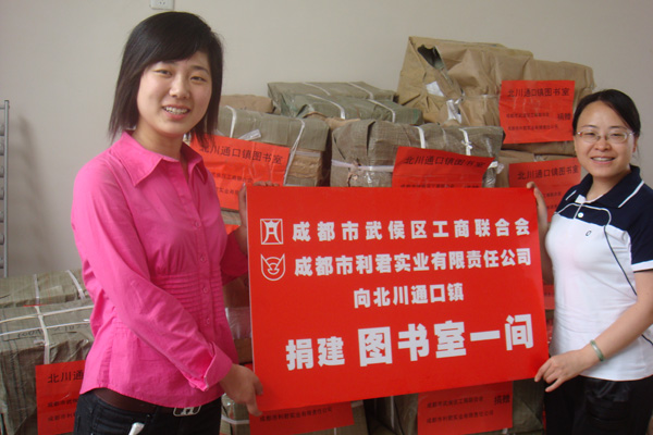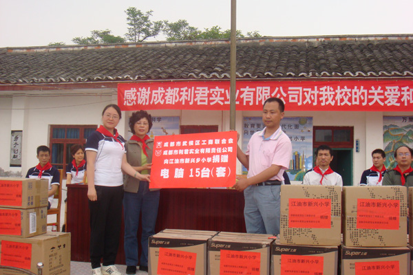 “送一份禮物,寄一份關(guān)愛(ài)”,在紀(jì)念“5.12”汶川大地震一周年之際,成都市利君實(shí)業(yè)有限責(zé)任公司向地震重災(zāi)區(qū)北川縣通口鎮(zhèn)捐建圖書(shū)室一間,捐助圖書(shū)5100冊(cè),桌椅、電腦等物資。向江油市新興鄉(xiāng)小學(xué),捐贈(zèng)電腦15臺(tái)(套)。